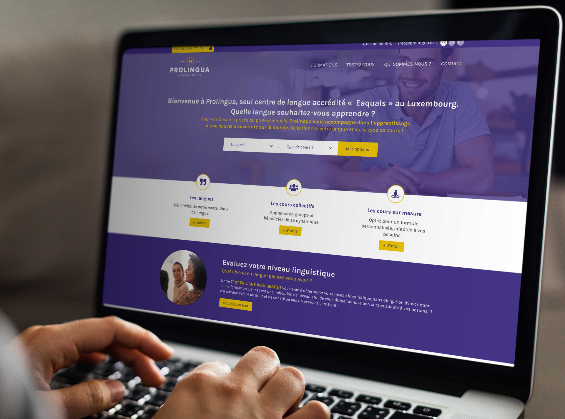 Pour vos besoins privés ou professionnels, PROLINGUA vous accompagne tout au long de votre formation linguistique. Dans ce cadre, un nouvel outil en ligne était indispensable. PROLINGUA a donc confié cette mission à INPENT, avec entre autre un test de langue en ligne, un centre de réservation de cours, le catalogue de toutes les formations, ... Nos missions :